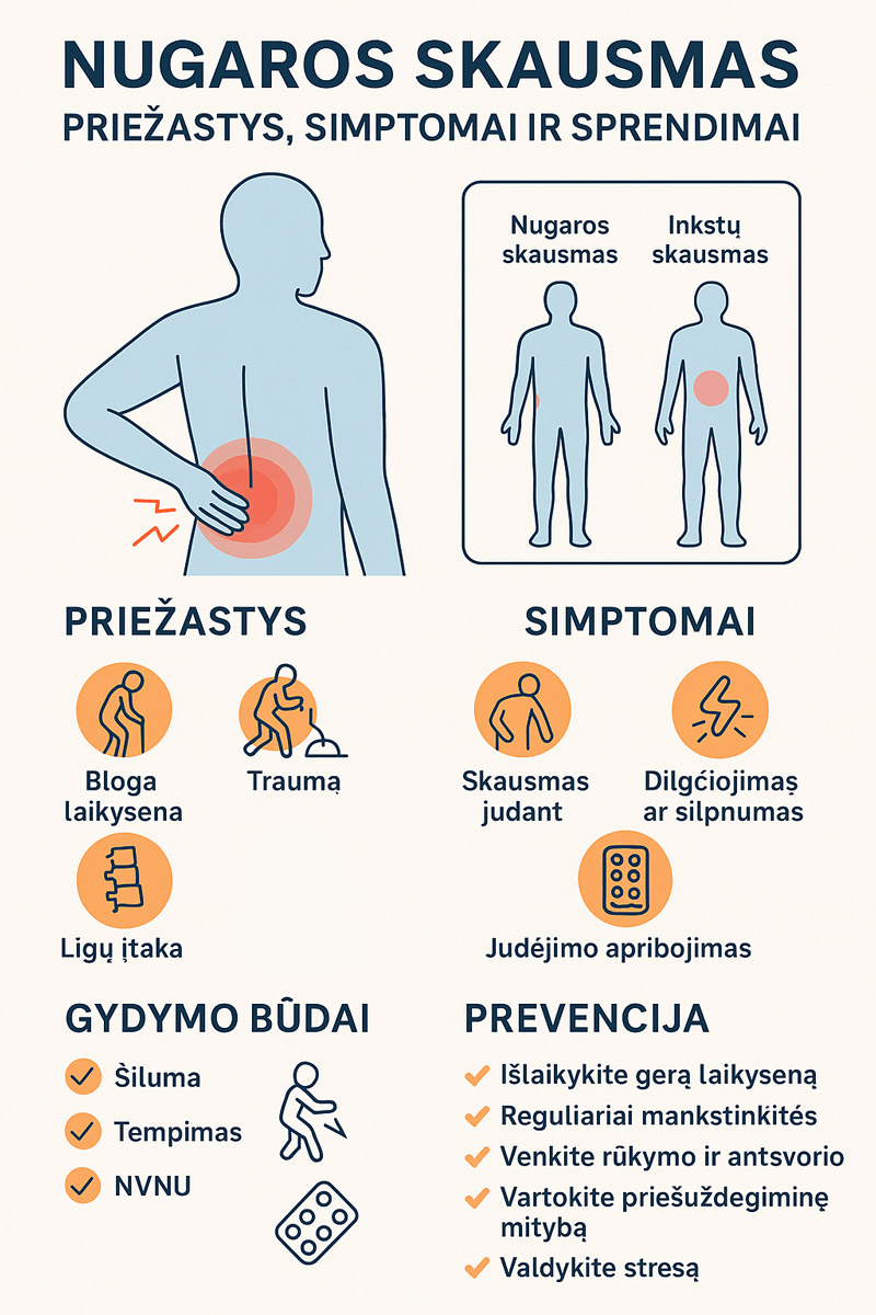 - Nugaros skausmas gali atsirasti dėl tokių priežasčių kaip netinkama laikysena, traumos, amžius ar pagrindinės ligos, dėl kurių atsiranda tokie simptomai kaip sustingimas ir ribotas judrumas.